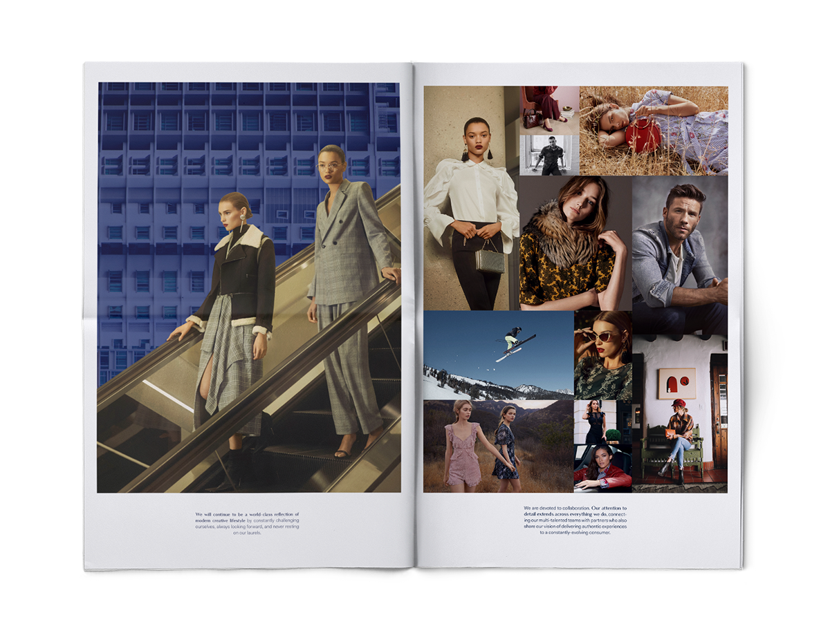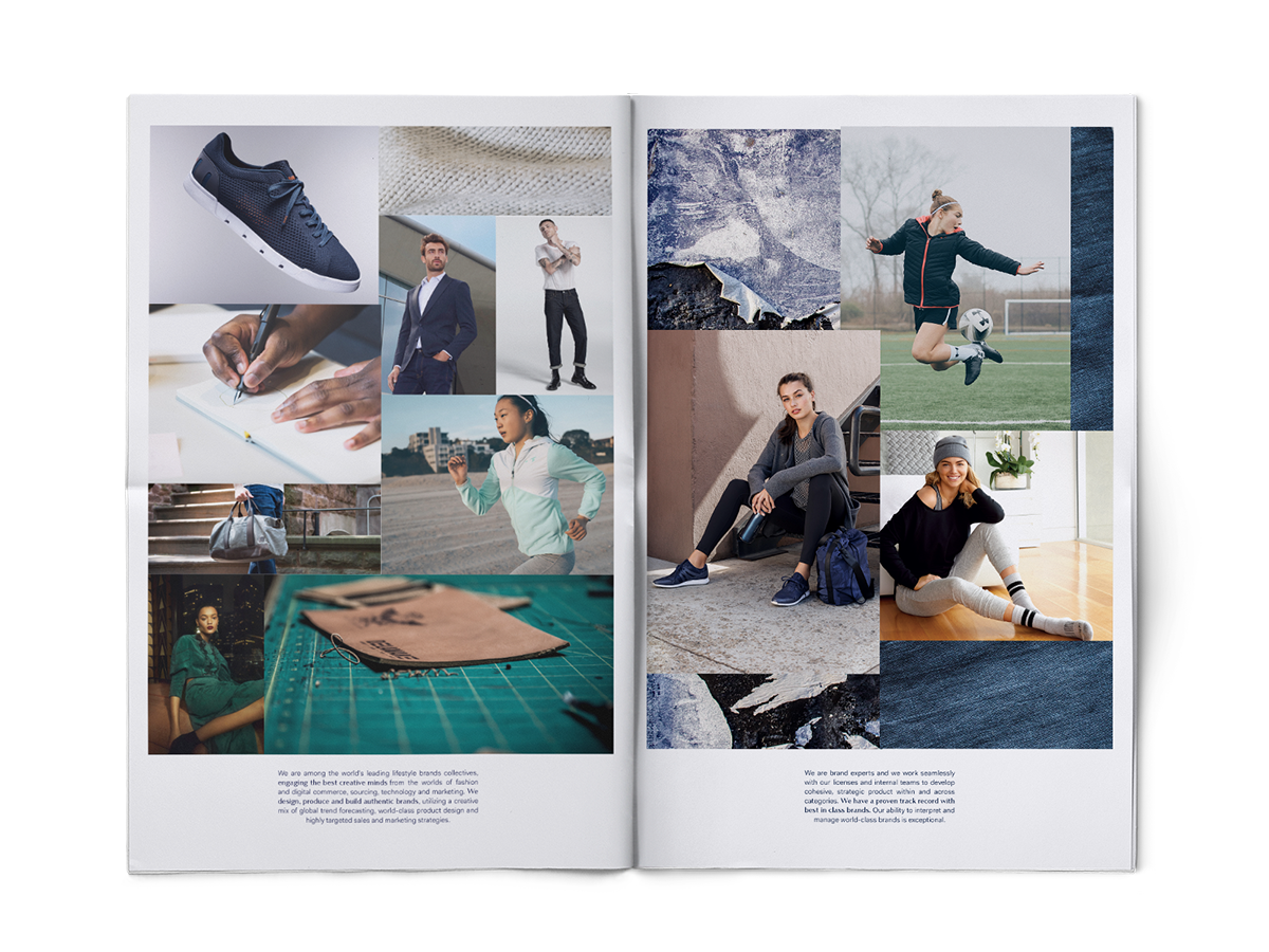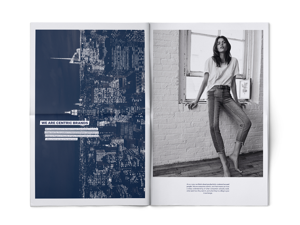 Centric Brands launch takeaway, 2018. Tabloid newsprint utilizing brand holding imagery (digital collages my own) and cc stock. Concentric text along bottom cover repeats brand statement.