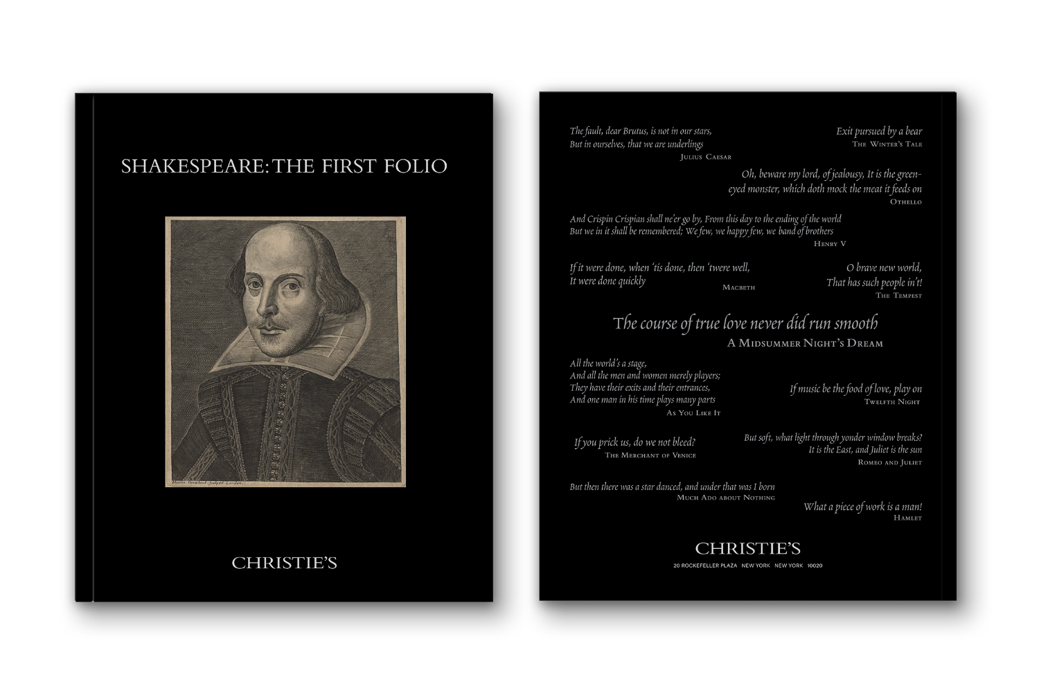 Christie's single-item specialty catalog, 2020. Devoted to the auction of an edition of Shakespeare's first folio. Information table on the included works was developed to reflect the structure of the ToC. Elements like pull quotes and text decorations were directly inspired by the type within the folio.