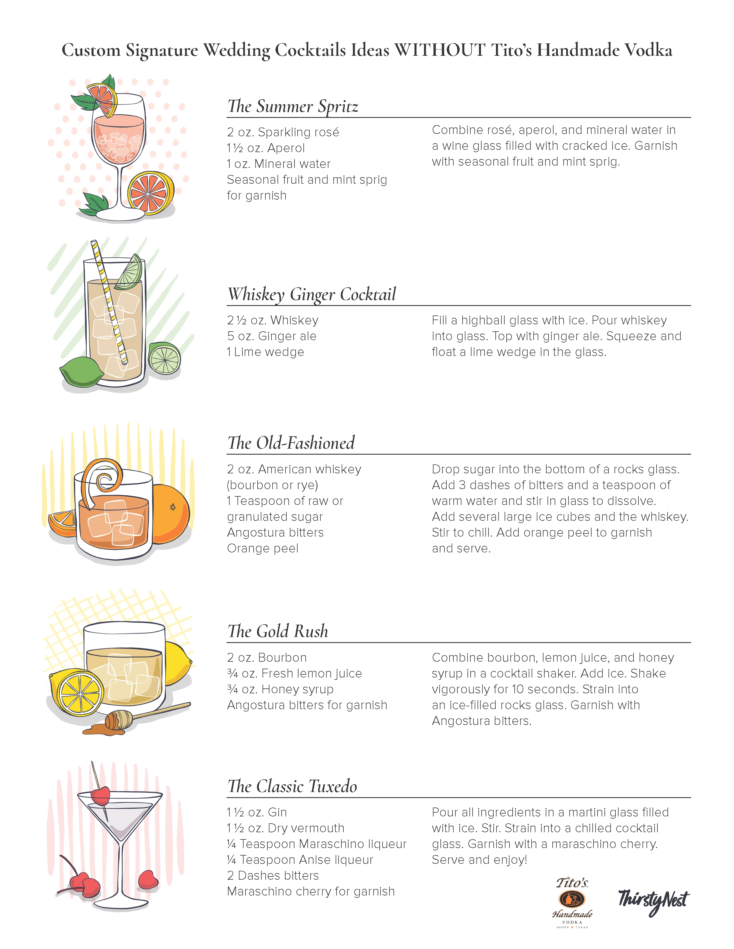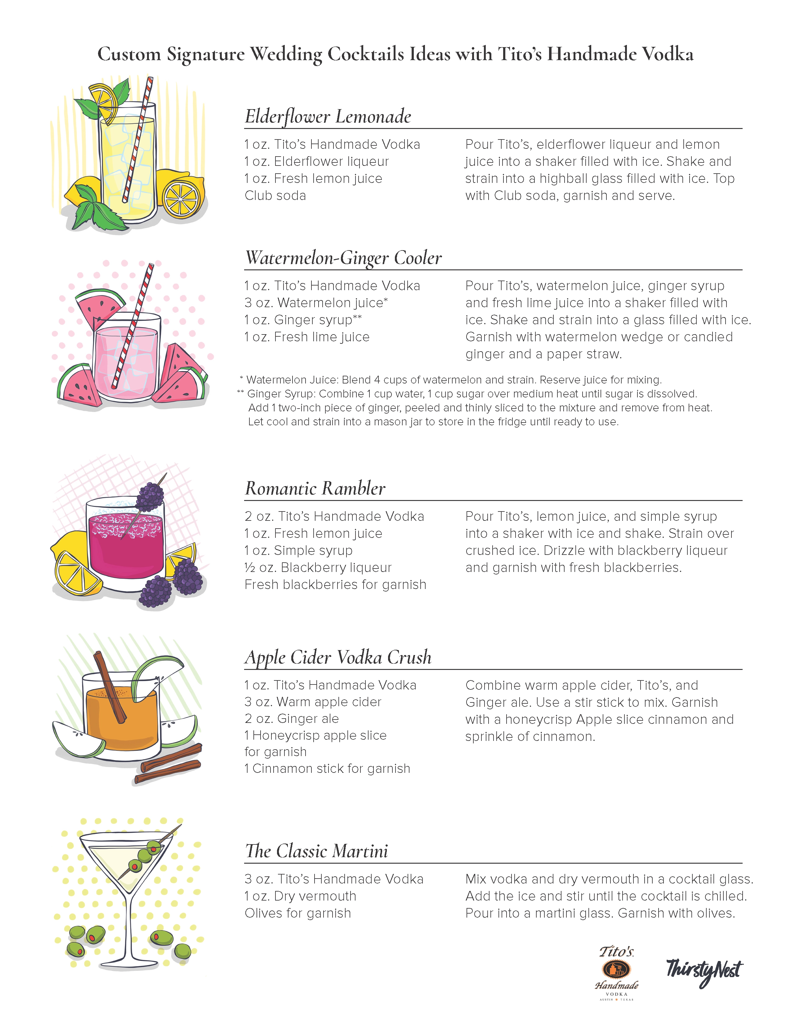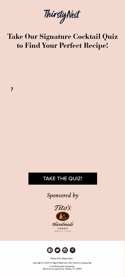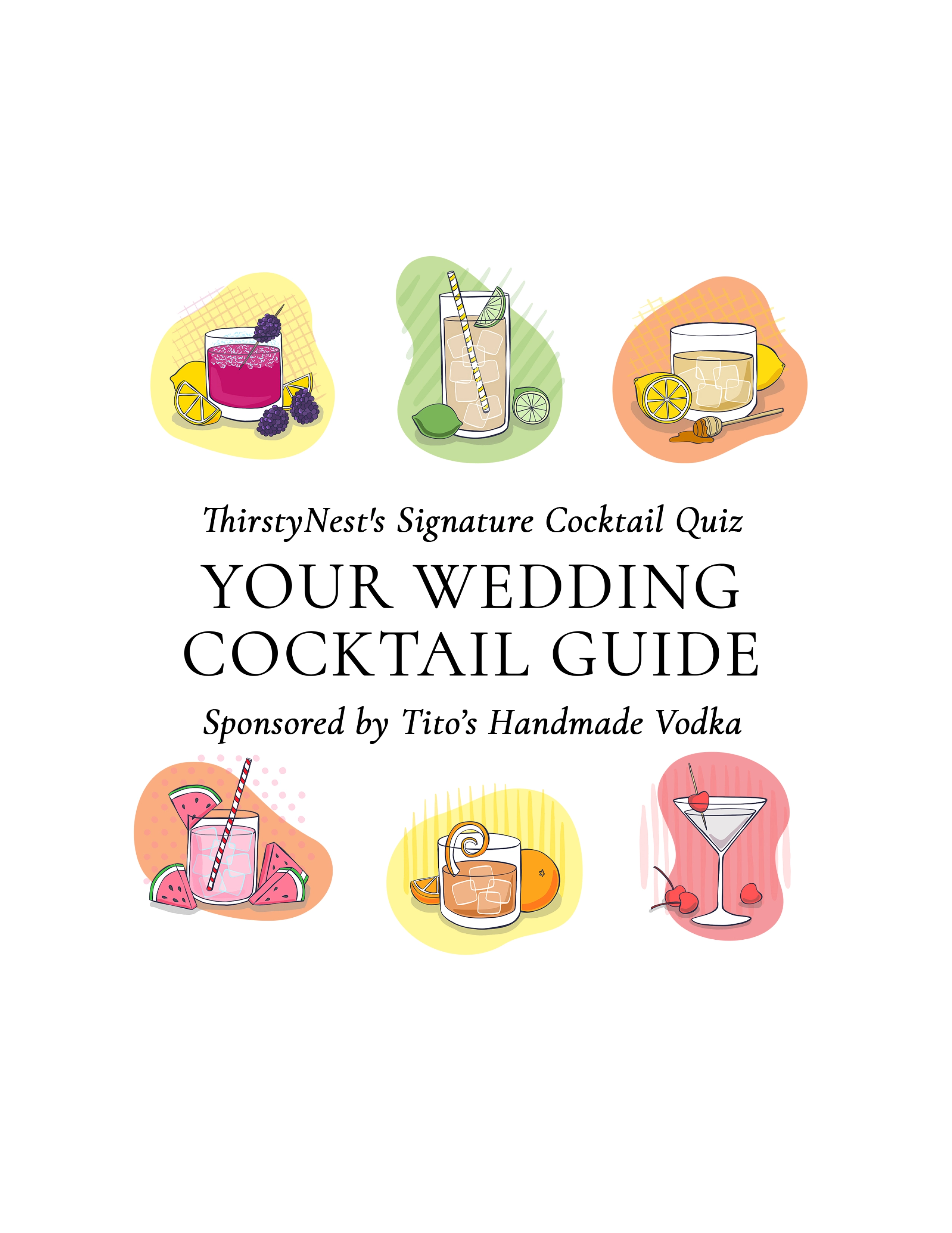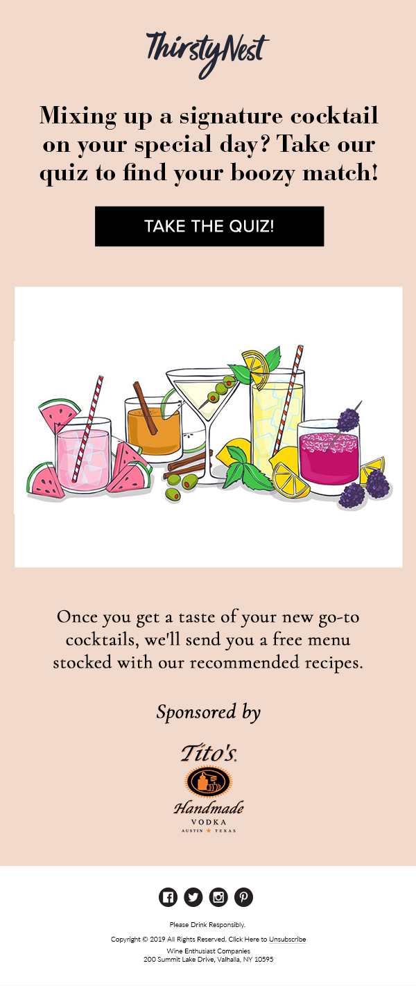 Freelance work on a partnered campaign for the wedding site ThirstyNest. Using their media channels (email, social, site advertising), I created the assets around a personality quiz leading to a Tito's Handmade Vodka cocktail recipe. The complete printable guide was made available for download. Illustrations provided, solid backgrounds added in specific use-cases.